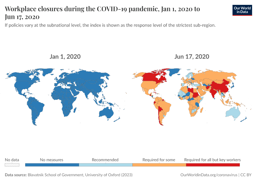 Blavatnik School of Government, University of Oxford (2023) – with minor processing by Our World in Data. “Workplace closures during the COVID-19 pandemic” [dataset]. Blavatnik School of Government, University of Oxford, “Government Response Tracker (OxCGRT)” [original data]. Retrieved January 10, 2026 from https://archive.ourworldindata.org/20250909-093708/grapher/workplace-closures-covid.html (archived on September 9, 2025).