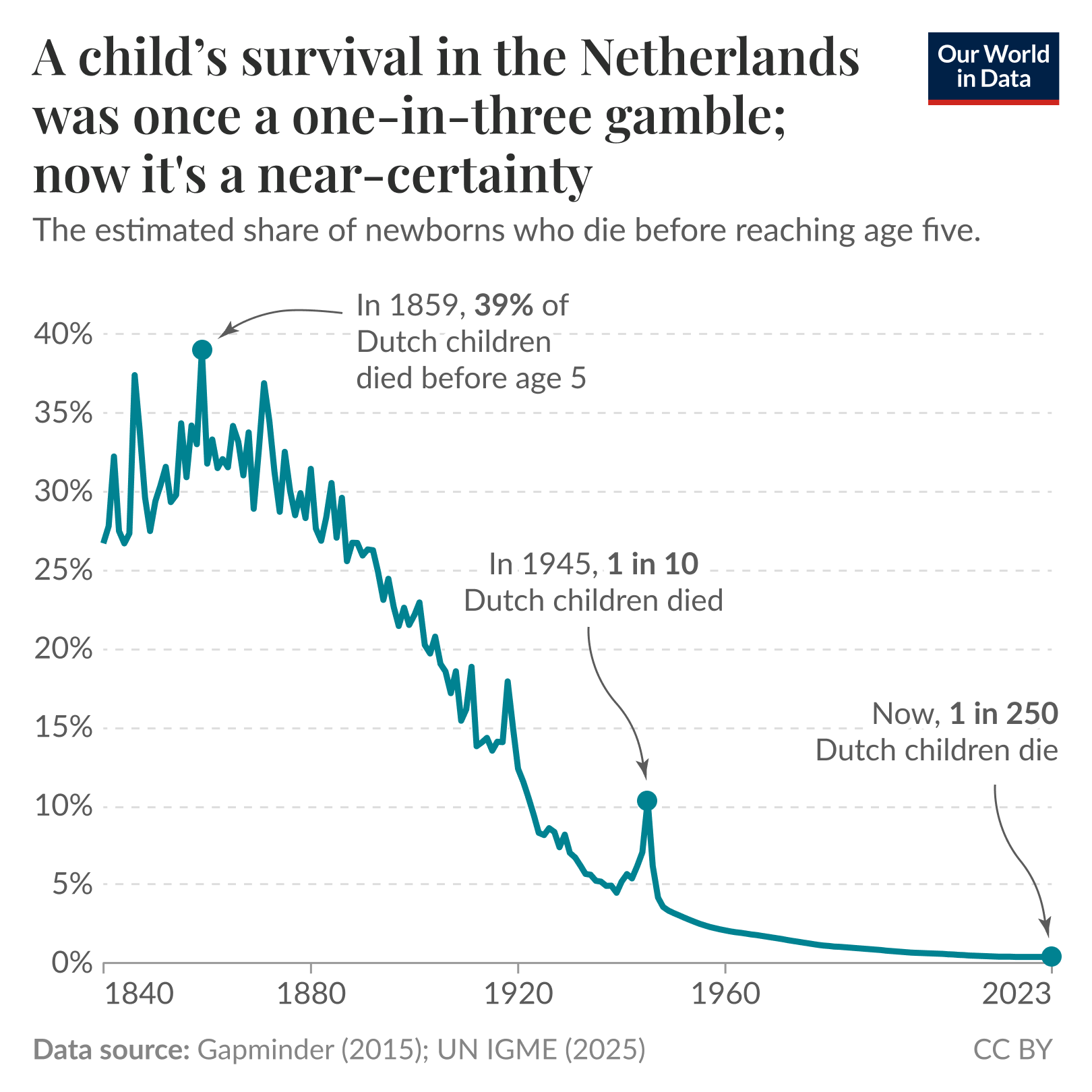 The chart shows our long-run data on child mortality, which allows you to see how child mortality has changed in countries around the world.