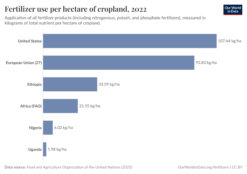 The European Union and the United States use about five times as much fertilizer per hectare as the African average. Within Africa, many countries use much less than this — as little as a few kilograms per hectare. Some lower-income countries use almost no fertilizers or pesticides and have little to regulate. This is shown in the chart below.