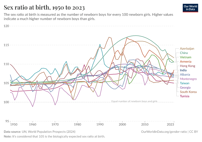 Sex ratios — the ratio of males and females — at birth are male-biased across every country in the world. In our section above, we explain why we'd expect this to be the case for biological reasons. The so-called "expected" sex ratio at birth was around 105 males per 100 females.