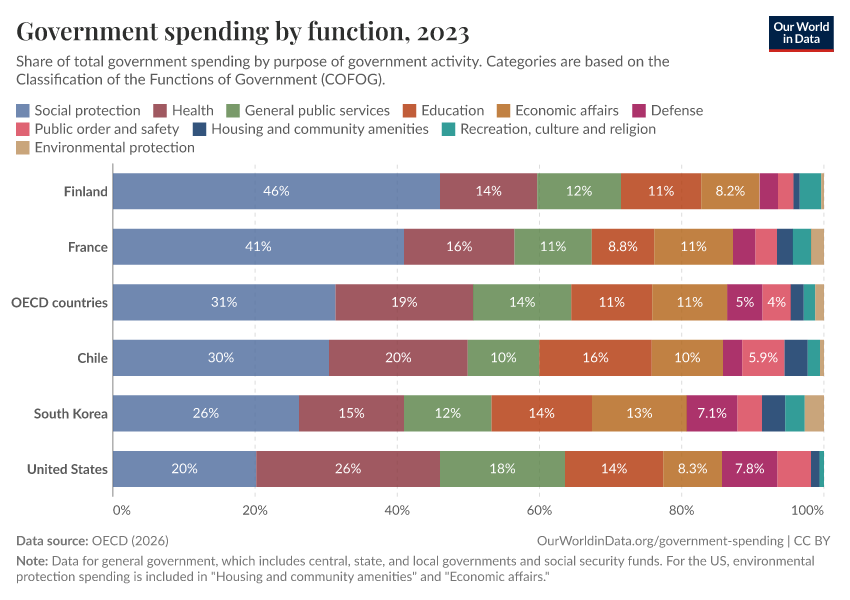 The chart shows how governments divide total spending across ten categories.1 You can also see spending in these categories as a share of GDP.