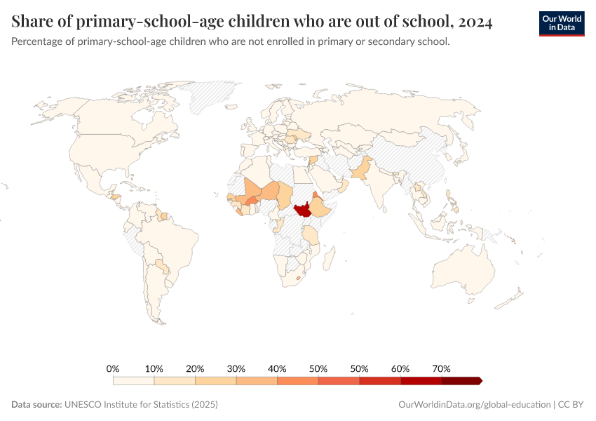 UNESCO Institute for Statistics (2025) – with minor processing by Our World in Data. “Out-of-school rate for children of primary school age” [dataset]. UNESCO Institute for Statistics, “UNESCO Institute for Statistics (UIS) - Education” [original data]. Retrieved December 11, 2025 from https://archive.ourworldindata.org/20250909-093708/grapher/share-primary-school-age-out-of-school.html (archived on September 9, 2025).