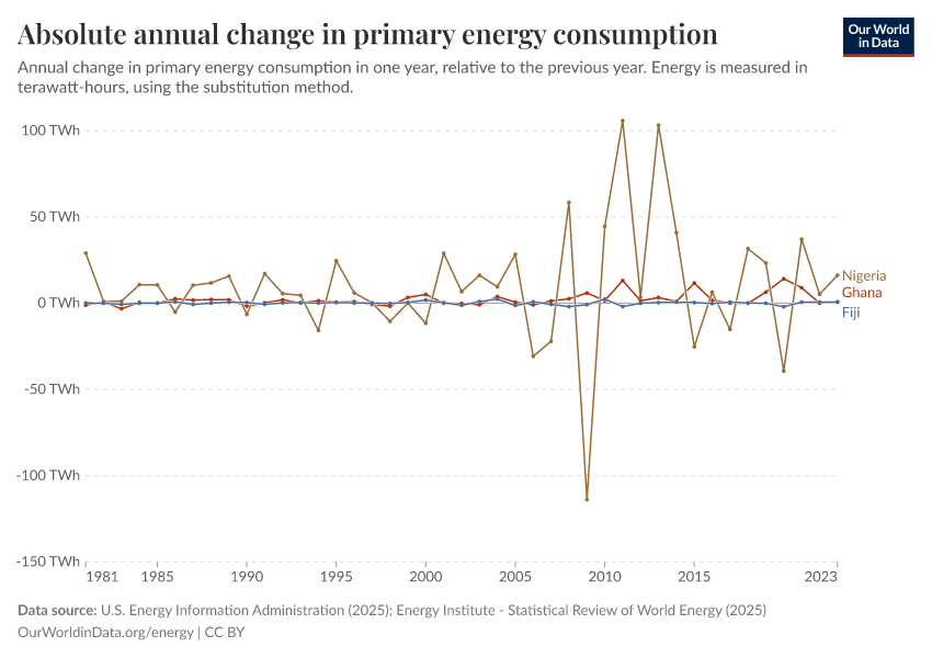 U.S. Energy Information Administration (2025); Energy Institute - Statistical Review of World Energy (2025) – with major processing by Our World in Data. “Annual change in primary energy consumption” [dataset]. U.S. Energy Information Administration, “International Energy Data”; Energy Institute, “Statistical Review of World Energy” [original data]. Retrieved January 12, 2026 from https://archive.ourworldindata.org/20250909-093708/grapher/abs-change-energy-consumption.html (archived on September 9, 2025).