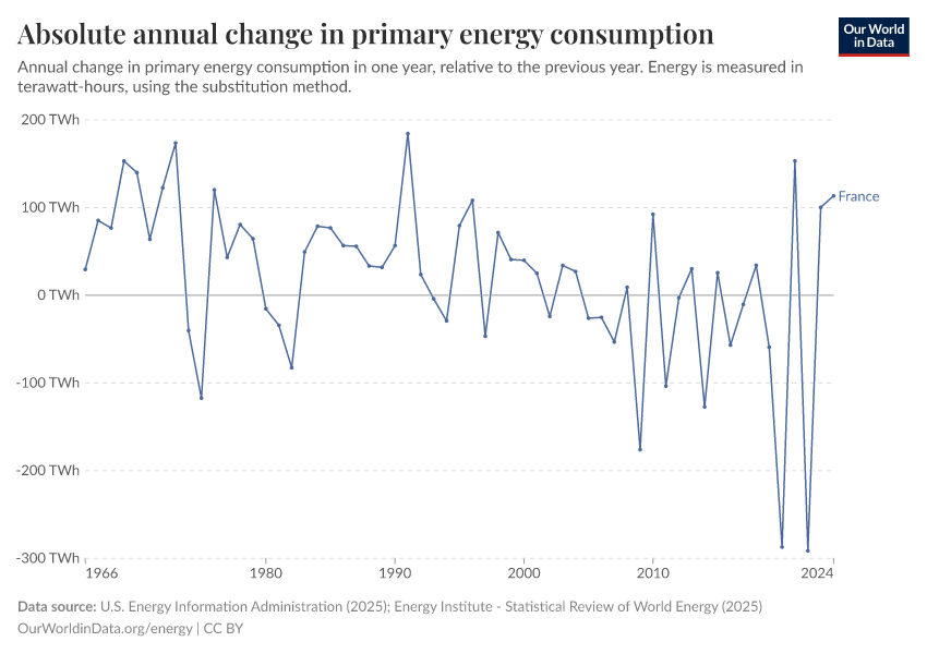 “Data Page: Annual change in primary energy consumption”, part of the following publication: Hannah Ritchie, Pablo Rosado, and Max Roser (2023) - “Energy”. Data adapted from U.S. Energy Information Administration, Energy Institute. Retrieved from https://archive.ourworldindata.org/20250909-093708/grapher/abs-change-energy-consumption.html [online resource] (archived on September 9, 2025).