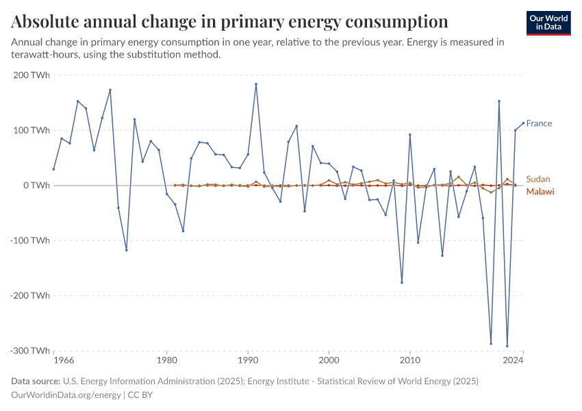 U.S. Energy Information Administration (2025); Energy Institute - Statistical Review of World Energy (2025) – with major processing by Our World in Data. “Annual change in primary energy consumption” [dataset]. U.S. Energy Information Administration, “International Energy Data”; Energy Institute, “Statistical Review of World Energy” [original data]. Retrieved January 2, 2026 from https://archive.ourworldindata.org/20250909-093708/grapher/abs-change-energy-consumption.html (archived on September 9, 2025).
