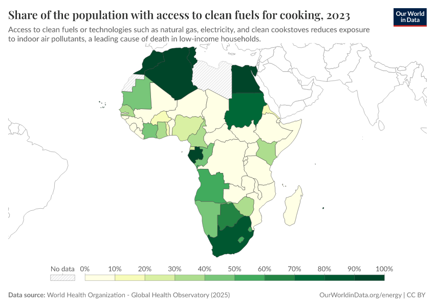 World Health Organization - Global Health Observatory (2025) – processed by Our World in Data. “Share of the population with access to clean fuels for cooking” [dataset]. World Health Organization, “Global Health Observatory” [original data]. Retrieved January 16, 2026 from https://archive.ourworldindata.org/20250909-093708/grapher/access-to-clean-fuels-and-technologies-for-cooking.html (archived on September 9, 2025).