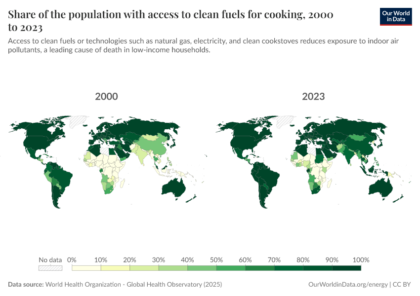 World Health Organization - Global Health Observatory (2025) – processed by Our World in Data. “Share of the population with access to clean fuels for cooking” [dataset]. World Health Organization, “Global Health Observatory” [original data]. Retrieved January 28, 2026 from https://archive.ourworldindata.org/20260119-070102/grapher/access-to-clean-fuels-and-technologies-for-cooking.html (archived on January 19, 2026).