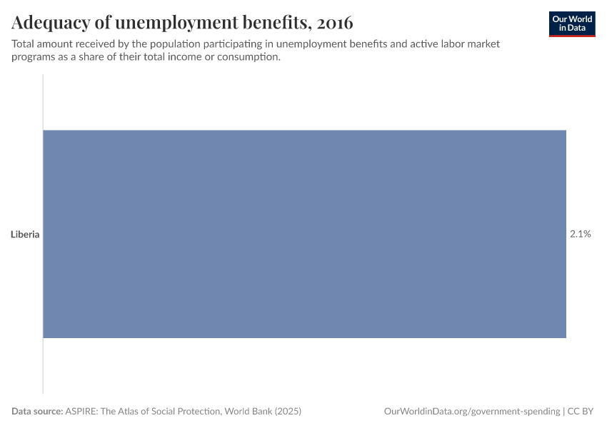 “Data Page: Adequacy of unemployment benefits”. Our World in Data (2025). Data adapted from ASPIRE: The Atlas of Social Protection, World Bank. Retrieved from https://archive.ourworldindata.org/20251220-152415/grapher/adequacy-of-unemployment-benefits.html [online resource] (archived on December 20, 2025).How to cite this data