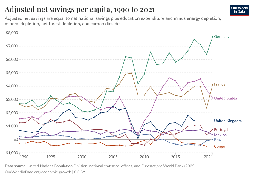 “Data Page: Adjusted net savings per capita”. Our World in Data (2026). Data adapted from United Nations Population Division, national statistical offices, and Eurostat, via World Bank. Retrieved from https://archive.ourworldindata.org/20251220-152415/grapher/adjusted-net-savings-per-person.html [online resource] (archived on December 20, 2025).How to cite this data
