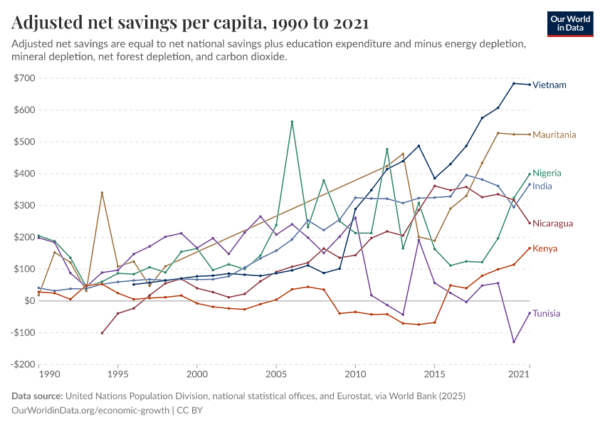 “Data Page: Adjusted net savings per capita”. Our World in Data (2026). Data adapted from United Nations Population Division, national statistical offices, and Eurostat, via World Bank. Retrieved from https://archive.ourworldindata.org/20251220-152415/grapher/adjusted-net-savings-per-person.html [online resource] (archived on December 20, 2025).How to cite this data