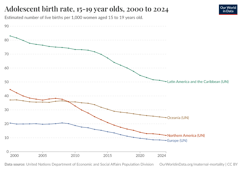 “Data Page: Adolescent birth rate, 15-19 year olds”. Our World in Data (2025). Data adapted from United Nations Department of Economic and Social Affairs Population Division. Retrieved from https://archive.ourworldindata.org/20251127-104454/grapher/adolescent-fertility-15-19.html [online resource] (archived on November 27, 2025).How to cite this data