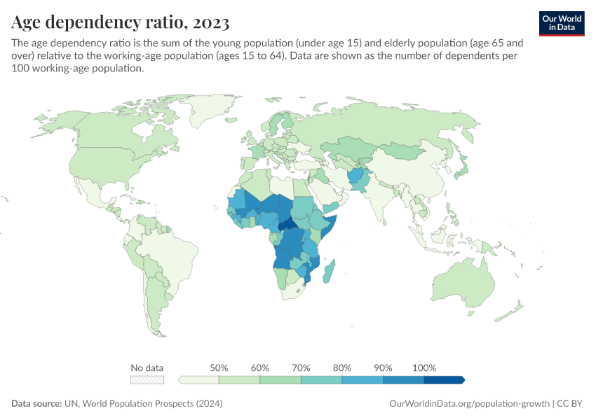 UN, World Population Prospects (2024) – processed by Our World in Data. “Total dependency ratio, age total – UN WPP” [dataset]. United Nations, “World Population Prospects”; United Nations, “World Population Prospects - Interim Update” [original data]. Retrieved April 14, 2026 from https://archive.ourworldindata.org/20260402-160819/grapher/age-dependency-ratio-of-working-age-population.html (archived on April 2, 2026).