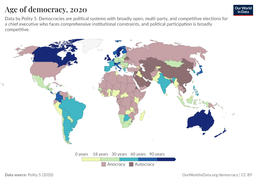 Polity 5 (2020) – processed by Our World in Data. “Age of democracy” [dataset]. Polity 5, “Polity5 Project, Political Regime Characteristics and Transitions, 1800-2018 5” [original data]. Retrieved January 11, 2026 from https://archive.ourworldindata.org/20250909-093708/grapher/age-of-democracy-polity.html (archived on September 9, 2025).