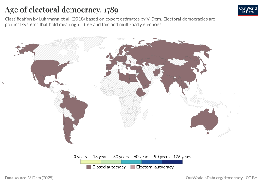 “Data Page: Age of electoral democracy”, part of the following publication: Bastian Herre, Lucas Rodés-Guirao, and Esteban Ortiz-Ospina (2013) - “Democracy”. Data adapted from V-Dem. Retrieved from https://archive.ourworldindata.org/20250909-093708/grapher/age-of-electoral-democracy.html [online resource] (archived on September 9, 2025).