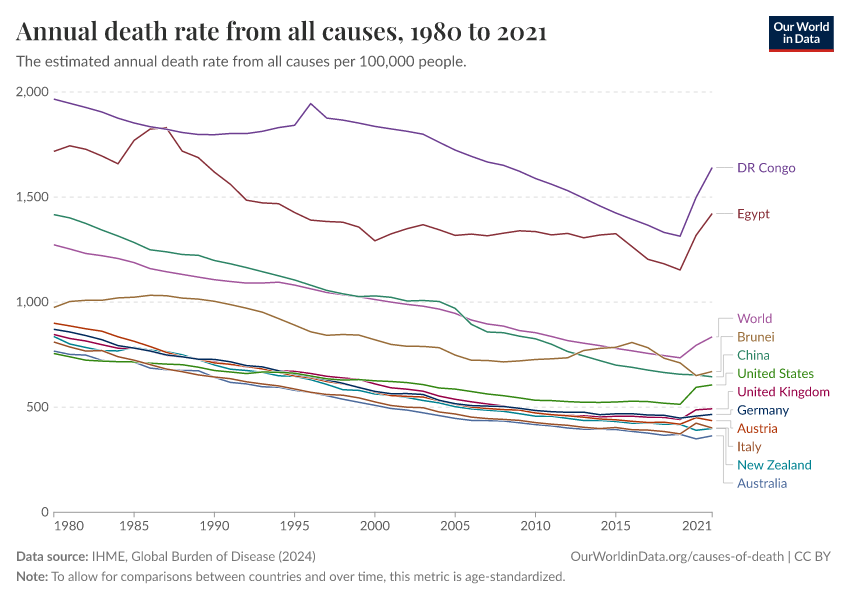 IHME, Global Burden of Disease (2024) – with minor processing by Our World in Data. “Annual death rate from all causes” [dataset]. IHME, Global Burden of Disease, “Global Burden of Disease - Deaths and DALYs” [original data]. Retrieved January 16, 2026 from https://archive.ourworldindata.org/20250909-093708/grapher/age-standardized-deaths-from-all-causes.html (archived on September 9, 2025).