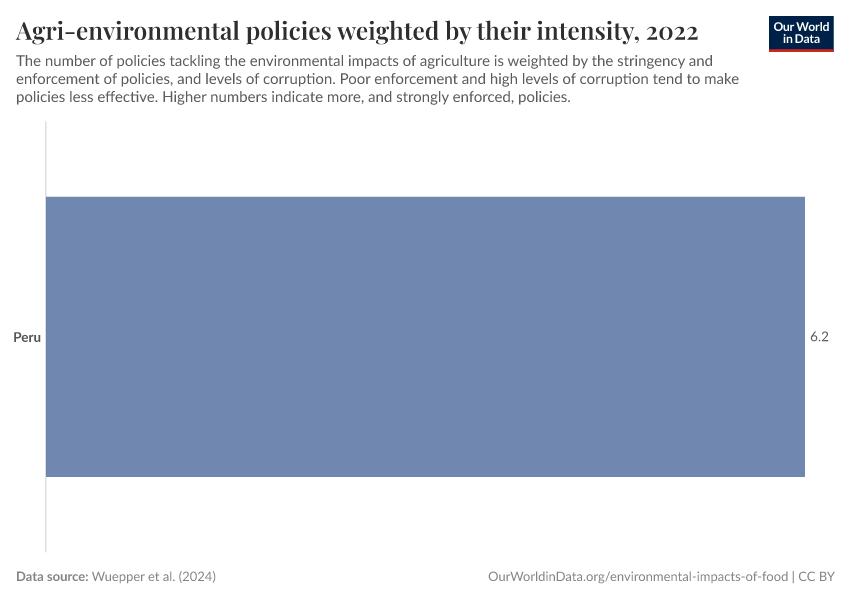 “Data Page: Agri-environmental policies weighted by their intensity”. Our World in Data (2025). Data adapted from Wuepper et al. (2024). Retrieved from https://archive.ourworldindata.org/20250909-093708/grapher/agri-environmental-policies-intensity.html [online resource] (archived on September 9, 2025).How to cite this data