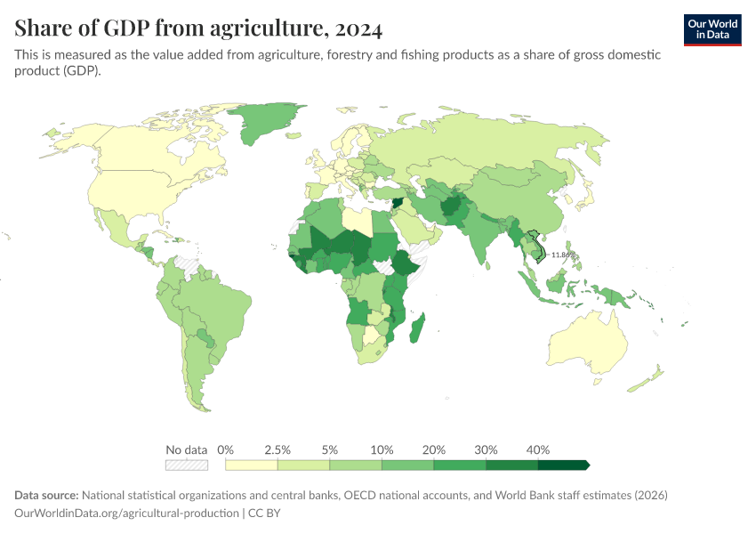 “Data Page: Share of GDP from agriculture”. Our World in Data (2026). Data adapted from National statistical organizations and central banks, OECD national accounts, and World Bank staff estimates. Retrieved from https://archive.ourworldindata.org/20260417-112857/grapher/agriculture-share-gdp.html [online resource] (archived on April 17, 2026).How to cite this data