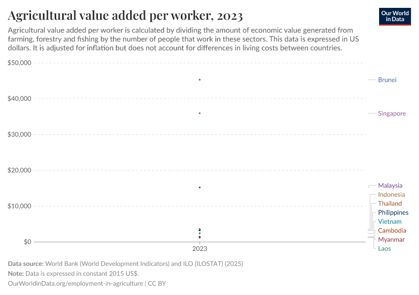 “Data Page: Agricultural value added per worker”. Our World in Data (2026). Data adapted from World Bank (World Development Indicators) and ILO (ILOSTAT). Retrieved from https://archive.ourworldindata.org/20251220-152415/grapher/agriculture-value-added-per-worker-wdi.html [online resource] (archived on December 20, 2025).How to cite this data