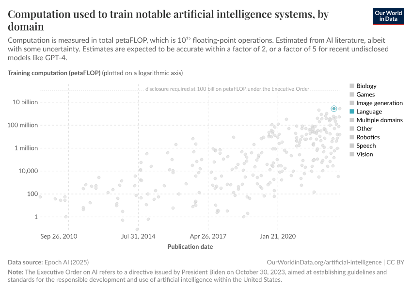 Epoch AI (2025) – with major processing by Our World in Data. “Computation used to train notable artificial intelligence systems, by domain” [dataset]. Epoch AI, “Parameter, Compute and Data Trends in Machine Learning” [original data]. Retrieved December 7, 2025 from https://archive.ourworldindata.org/20251009-110947/grapher/artificial-intelligence-training-computation.html (archived on October 9, 2025).