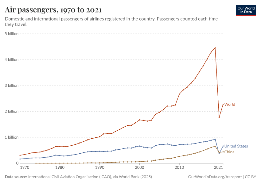 “Data Page: Air passengers”. Our World in Data (2025). Data adapted from International Civil Aviation Organization (ICAO), via World Bank. Retrieved from https://archive.ourworldindata.org/20250916-102301/grapher/air-passengers-carried.html [online resource] (archived on September 16, 2025).How to cite this data