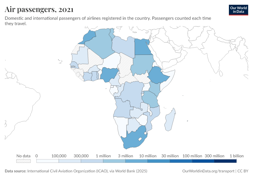 International Civil Aviation Organization (ICAO), via World Bank (2025) – processed by Our World in Data. “Air passengers” [dataset]. International Civil Aviation Organization (ICAO), via World Bank, “World Development Indicators 122” [original data]. Retrieved January 16, 2026 from https://archive.ourworldindata.org/20260112-111535/grapher/air-passengers-carried.html (archived on January 12, 2026).