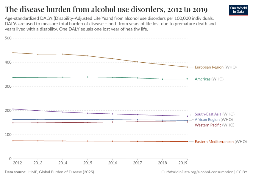 IHME, Global Burden of Disease (2025) – with major processing by Our World in Data. “The disease burden from alcohol use disorders” [dataset]. IHME, Global Burden of Disease, “Global Burden of Disease - DALYs” [original data]. Retrieved March 9, 2026 from https://archive.ourworldindata.org/20260304-094028/grapher/alcohol-disorders-dalys-age-standardized-rate.html (archived on March 4, 2026).