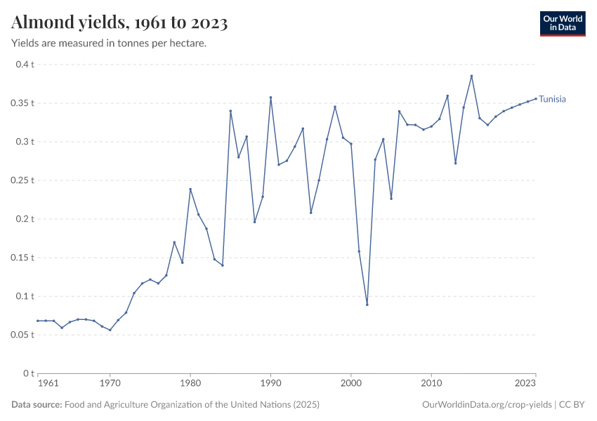 Food and Agriculture Organization of the United Nations (2025) – with major processing by Our World in Data. “Almond yields – UN FAO” [dataset]. Food and Agriculture Organization of the United Nations, “Production: Crops and livestock products” [original data]. Retrieved December 6, 2025 from https://archive.ourworldindata.org/20251014-161652/grapher/almond-yields.html (archived on October 14, 2025).