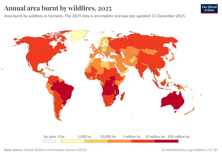 “Data Page: Annual area burnt by wildfires”, part of the following publication: Hannah Ritchie, Pablo Rosado, and Veronika Samborska (2024) - “Climate Change”. Data adapted from Global Wildfire Information System. Retrieved from https://archive.ourworldindata.org/20251212-095432/grapher/annual-area-burnt-by-wildfires.html [online resource] (archived on December 12, 2025).How to cite this data