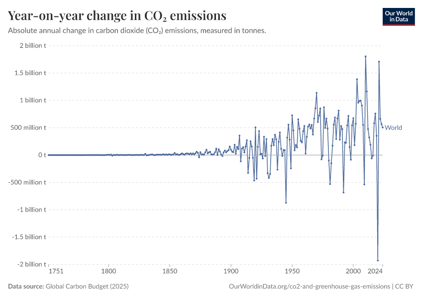 “Data Page: Year-on-year change in CO₂ emissions”, part of the following publication: Hannah Ritchie, Pablo Rosado, and Max Roser (2023) - “CO₂ and Greenhouse Gas Emissions”. Data adapted from Global Carbon Project. Retrieved from https://archive.ourworldindata.org/20260304-094028/grapher/absolute-change-co2.html [online resource] (archived on March 4, 2026).