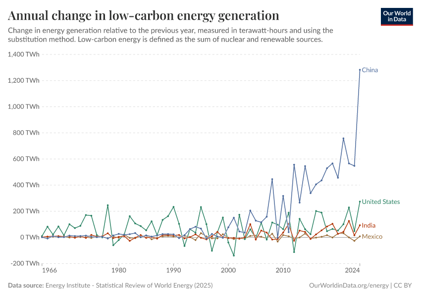 Energy Institute - Statistical Review of World Energy (2025) – with major processing by Our World in Data. “Annual change in low-carbon energy consumption – Using the substitution method” [dataset]. Energy Institute, “Statistical Review of World Energy” [original data]. Retrieved December 7, 2025 from https://archive.ourworldindata.org/20250909-093708/grapher/annual-change-low-carbon-energy.html (archived on September 9, 2025).