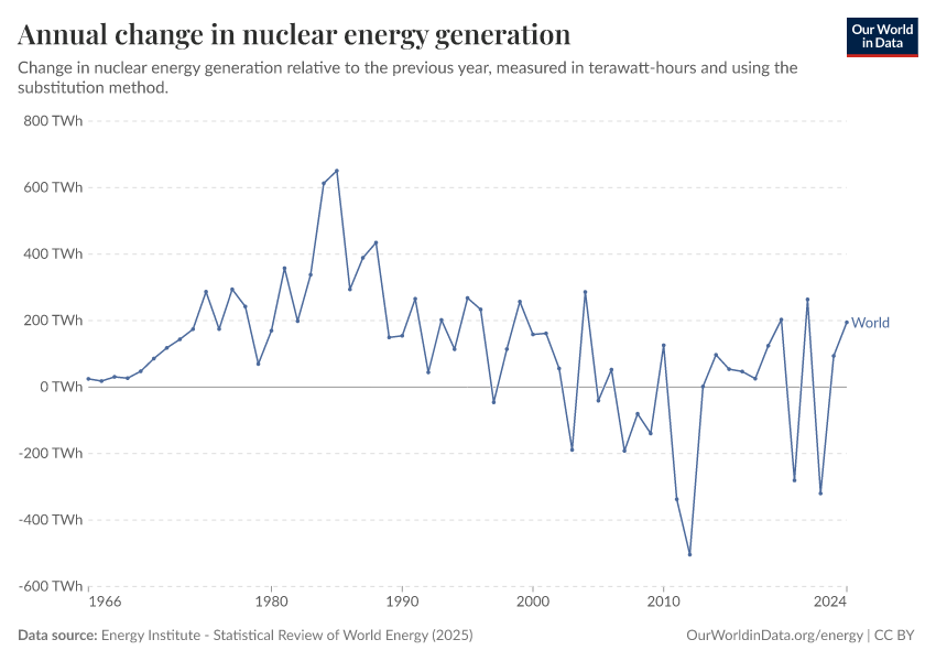Energy Institute - Statistical Review of World Energy (2025) – with major processing by Our World in Data. “Annual change in nuclear power consumption – Using the substitution method” [dataset]. Energy Institute, “Statistical Review of World Energy” [original data]. Retrieved April 22, 2026 from https://archive.ourworldindata.org/20260417-112857/grapher/annual-change-nuclear.html (archived on April 17, 2026).Download