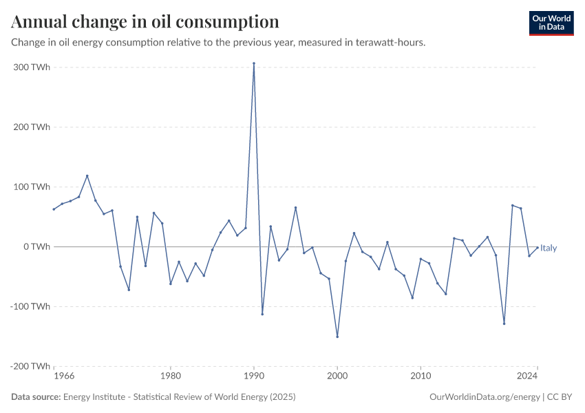 Energy Institute - Statistical Review of World Energy (2025) – with major processing by Our World in Data. “Annual change in oil consumption” [dataset]. Energy Institute, “Statistical Review of World Energy” [original data]. Retrieved January 15, 2026 from https://archive.ourworldindata.org/20250909-093708/grapher/annual-change-oil.html (archived on September 9, 2025).
