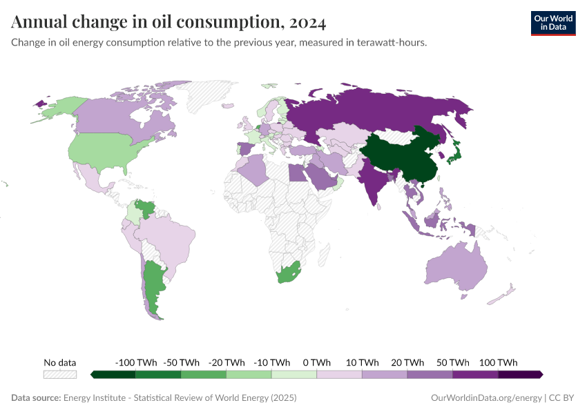 Energy Institute - Statistical Review of World Energy (2025) – with major processing by Our World in Data. “Annual change in oil consumption” [dataset]. Energy Institute, “Statistical Review of World Energy” [original data]. Retrieved December 18, 2025 from https://archive.ourworldindata.org/20250909-093708/grapher/annual-change-oil.html (archived on September 9, 2025).