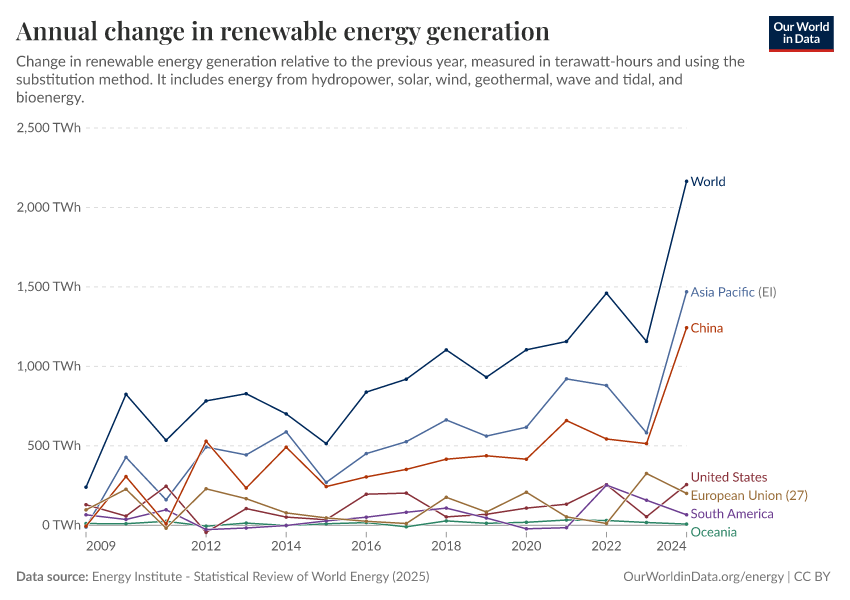 Energy Institute - Statistical Review of World Energy (2025) – with major processing by Our World in Data. “Annual change in renewables consumption – Using the substitution method” [dataset]. Energy Institute, “Statistical Review of World Energy” [original data]. Retrieved April 2, 2026 from https://archive.ourworldindata.org/20260304-094028/grapher/annual-change-renewables.html (archived on March 4, 2026).Download