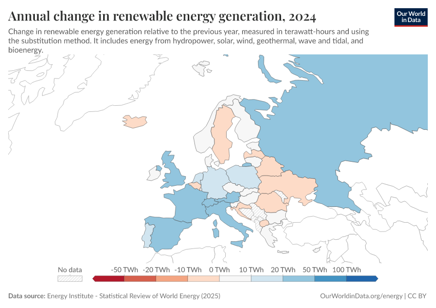 Energy Institute - Statistical Review of World Energy (2025) – with major processing by Our World in Data. “Annual change in renewables consumption – Using the substitution method” [dataset]. Energy Institute, “Statistical Review of World Energy” [original data]. Retrieved January 16, 2026 from https://archive.ourworldindata.org/20250909-093708/grapher/annual-change-renewables.html (archived on September 9, 2025).