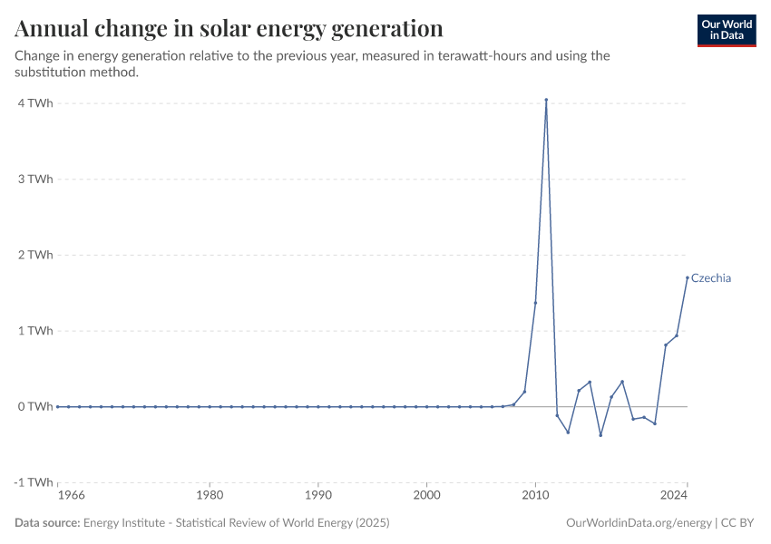 Energy Institute - Statistical Review of World Energy (2025) – with major processing by Our World in Data. “Annual change in solar power consumption – Using the substitution method” [dataset]. Energy Institute, “Statistical Review of World Energy” [original data]. Retrieved December 5, 2025 from https://archive.ourworldindata.org/20250909-093708/grapher/annual-change-solar.html (archived on September 9, 2025).