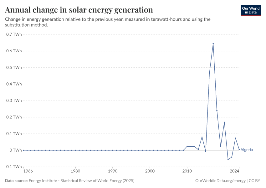 Energy Institute - Statistical Review of World Energy (2025) – with major processing by Our World in Data. “Annual change in solar power consumption – Using the substitution method” [dataset]. Energy Institute, “Statistical Review of World Energy” [original data]. Retrieved December 6, 2025 from https://archive.ourworldindata.org/20250909-093708/grapher/annual-change-solar.html (archived on September 9, 2025).