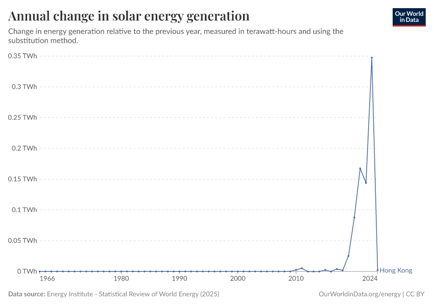 Energy Institute - Statistical Review of World Energy (2025) – with major processing by Our World in Data. “Annual change in solar power consumption – Using the substitution method” [dataset]. Energy Institute, “Statistical Review of World Energy” [original data]. Retrieved December 5, 2025 from https://archive.ourworldindata.org/20250909-093708/grapher/annual-change-solar.html (archived on September 9, 2025).