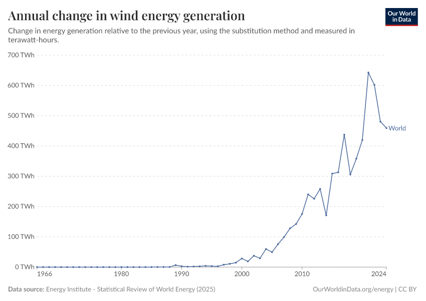 Energy Institute - Statistical Review of World Energy (2025) – with major processing by Our World in Data. “Annual change in wind power consumption – Using the substitution method” [dataset]. Energy Institute, “Statistical Review of World Energy” [original data]. Retrieved December 17, 2025 from https://archive.ourworldindata.org/20250909-093708/grapher/annual-change-wind.html (archived on September 9, 2025).