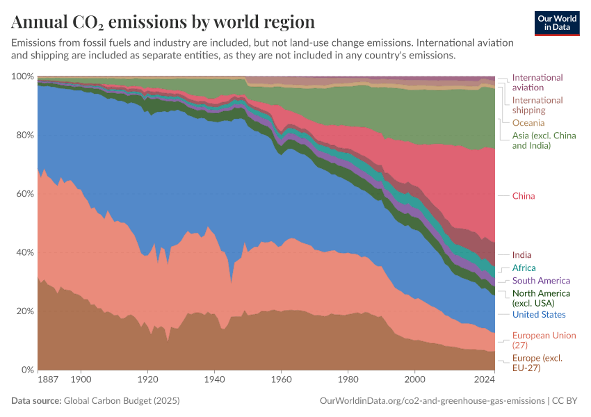 Global Carbon Budget (2025) – with major processing by Our World in Data. “Annual CO₂ emissions by world region” [dataset]. Global Carbon Project, “Global Carbon Budget v15” [original data]. Retrieved April 13, 2026 from https://archive.ourworldindata.org/20260304-094028/grapher/annual-co-emissions-by-region.html (archived on March 4, 2026).