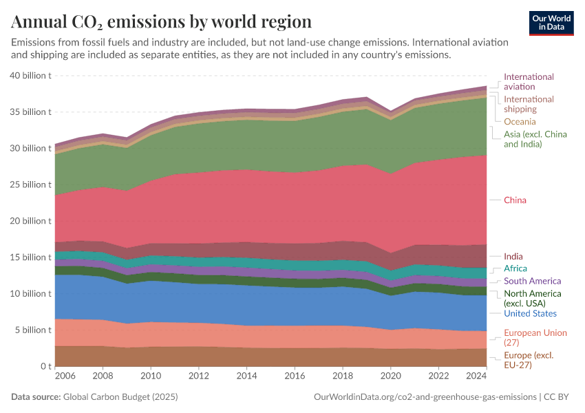 Global Carbon Budget (2025) – with major processing by Our World in Data. “Annual CO₂ emissions by world region” [dataset]. Global Carbon Project, “Global Carbon Budget v15” [original data]. Retrieved January 25, 2026 from https://archive.ourworldindata.org/20260119-070102/grapher/annual-co-emissions-by-region.html (archived on January 19, 2026).