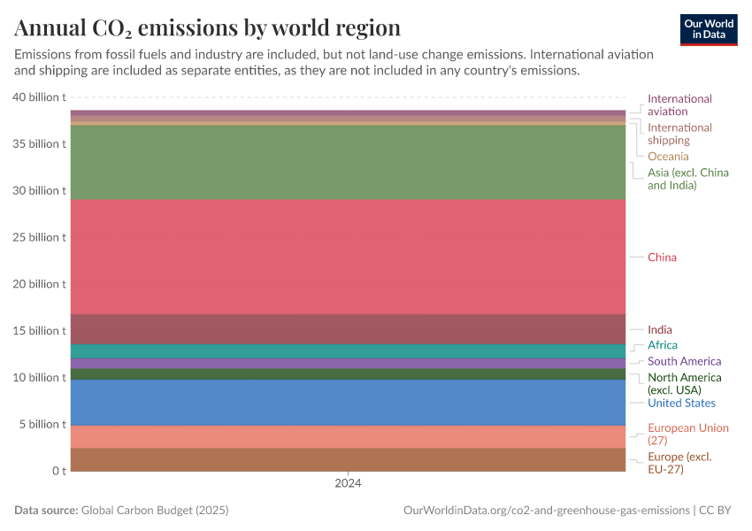 “Data Page: Annual CO₂ emissions by world region”, part of the following publication: Hannah Ritchie, Pablo Rosado, and Max Roser (2023) - “CO₂ and Greenhouse Gas Emissions”. Data adapted from Global Carbon Project. Retrieved from https://archive.ourworldindata.org/20251204-133459/grapher/annual-co-emissions-by-region.html [online resource] (archived on December 4, 2025).How to cite this data