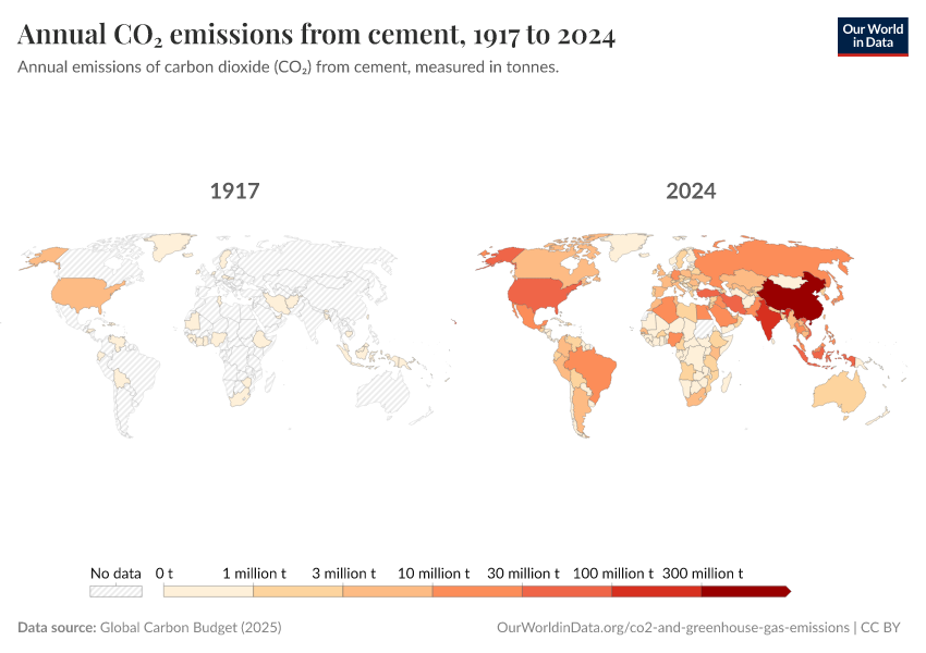 “Data Page: Annual CO₂ emissions from cement”, part of the following publication: Hannah Ritchie, Pablo Rosado, and Max Roser (2023) - “CO₂ and Greenhouse Gas Emissions”. Data adapted from Global Carbon Project. Retrieved from https://archive.ourworldindata.org/20251113-170236/grapher/annual-co2-cement.html [online resource] (archived on November 13, 2025).How to cite this data
