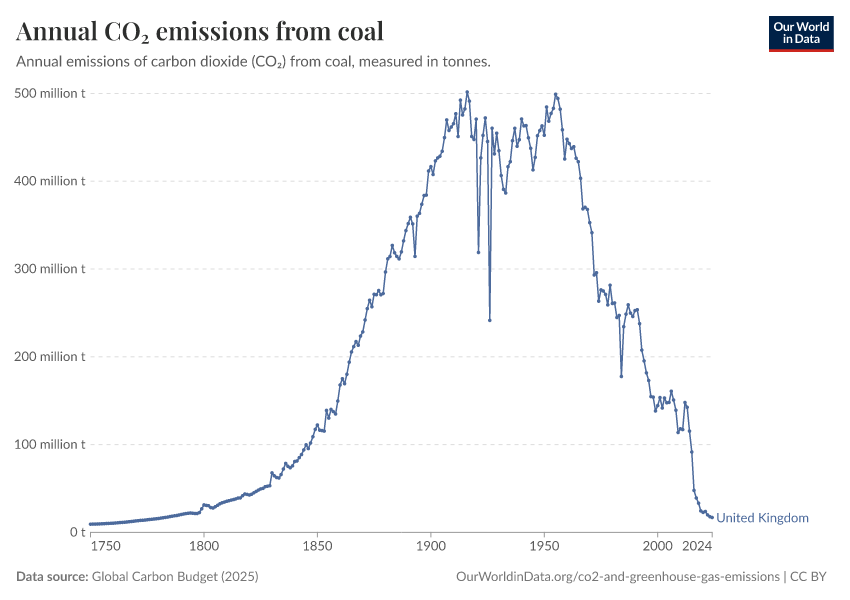 “Data Page: Annual CO₂ emissions from coal”, part of the following publication: Hannah Ritchie, Pablo Rosado, and Max Roser (2023) - “CO₂ and Greenhouse Gas Emissions”. Data adapted from Global Carbon Project. Retrieved from https://archive.ourworldindata.org/20251113-170236/grapher/annual-co2-coal.html [online resource] (archived on November 13, 2025).How to cite this data