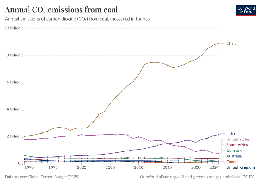 Global Carbon Budget (2025) – with major processing by Our World in Data. “Annual CO₂ emissions from coal” [dataset]. Global Carbon Project, “Global Carbon Budget v15” [original data]. Retrieved December 21, 2025 from https://archive.ourworldindata.org/20251113-170236/grapher/annual-co2-coal.html (archived on November 13, 2025).