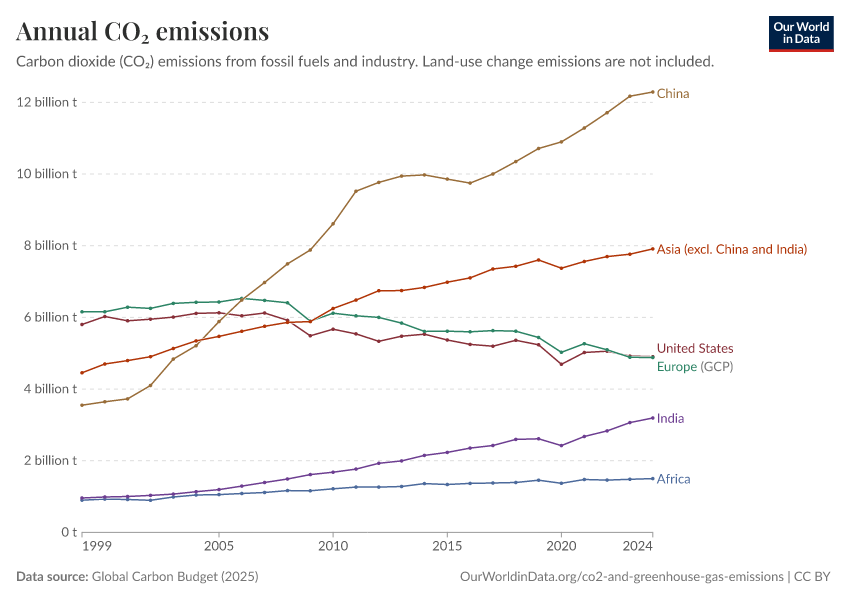 Global Carbon Budget (2025) – with major processing by Our World in Data. “Annual CO₂ emissions” [dataset]. Global Carbon Project, “Global Carbon Budget v15” [original data]. Retrieved March 18, 2026 from https://archive.ourworldindata.org/20260304-094028/grapher/annual-co2-emissions-per-country.html (archived on March 4, 2026).