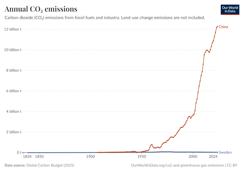 “Data Page: Annual CO₂ emissions”, part of the following publication: Hannah Ritchie, Pablo Rosado, and Max Roser (2023) - “CO₂ and Greenhouse Gas Emissions”. Data adapted from Global Carbon Project. Retrieved from https://archive.ourworldindata.org/20251204-133459/grapher/annual-co2-emissions-per-country.html [online resource] (archived on December 4, 2025).