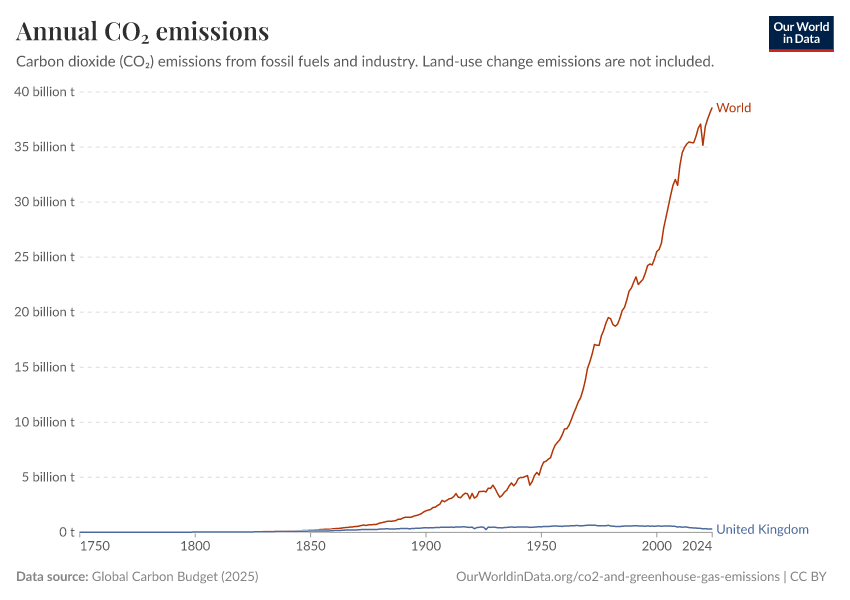 Global Carbon Budget (2025) – with major processing by Our World in Data. “Annual CO₂ emissions” [dataset]. Global Carbon Project, “Global Carbon Budget v15” [original data]. Retrieved December 20, 2025 from https://archive.ourworldindata.org/20251204-133459/grapher/annual-co2-emissions-per-country.html (archived on December 4, 2025).