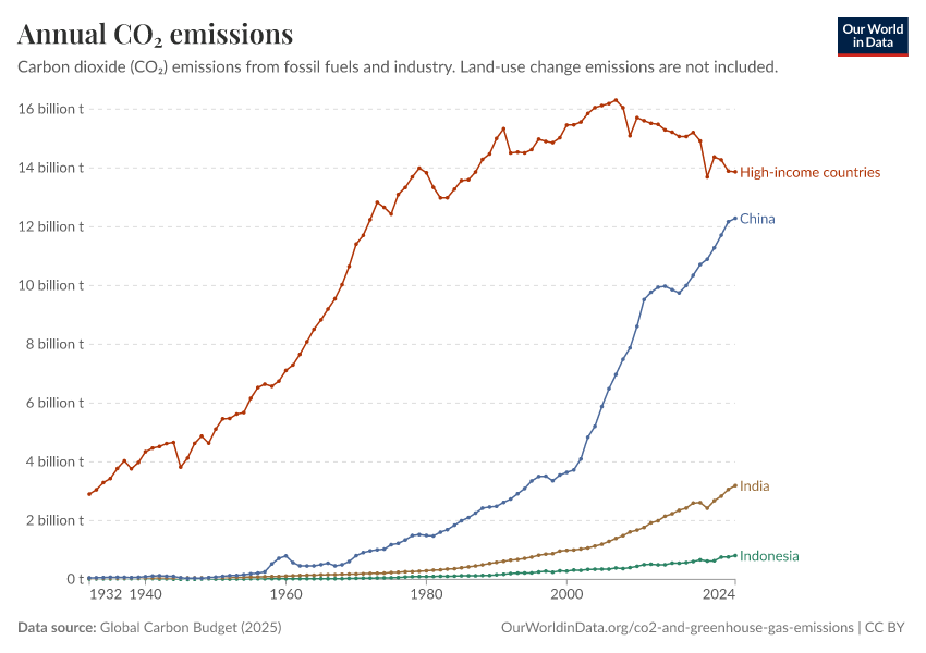 Global Carbon Budget (2025) – with major processing by Our World in Data. “Annual CO₂ emissions” [dataset]. Global Carbon Project, “Global Carbon Budget v15” [original data]. Retrieved February 18, 2026 from https://archive.ourworldindata.org/20260119-070102/grapher/annual-co2-emissions-per-country.html (archived on January 19, 2026).