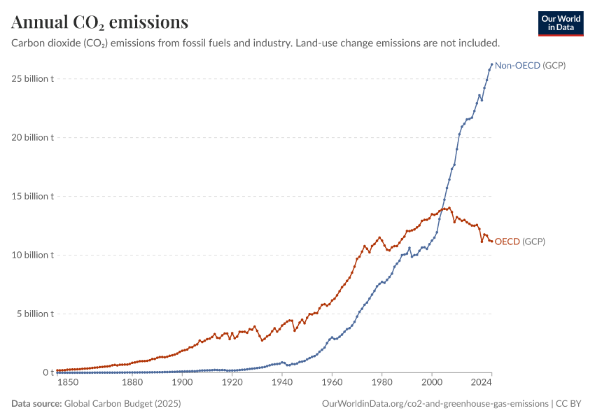 Global Carbon Budget (2025) – with major processing by Our World in Data. “Annual CO₂ emissions” [dataset]. Global Carbon Project, “Global Carbon Budget v15” [original data]. Retrieved April 28, 2026 from https://archive.ourworldindata.org/20260417-112857/grapher/annual-co2-emissions-per-country.html (archived on April 17, 2026).Download
